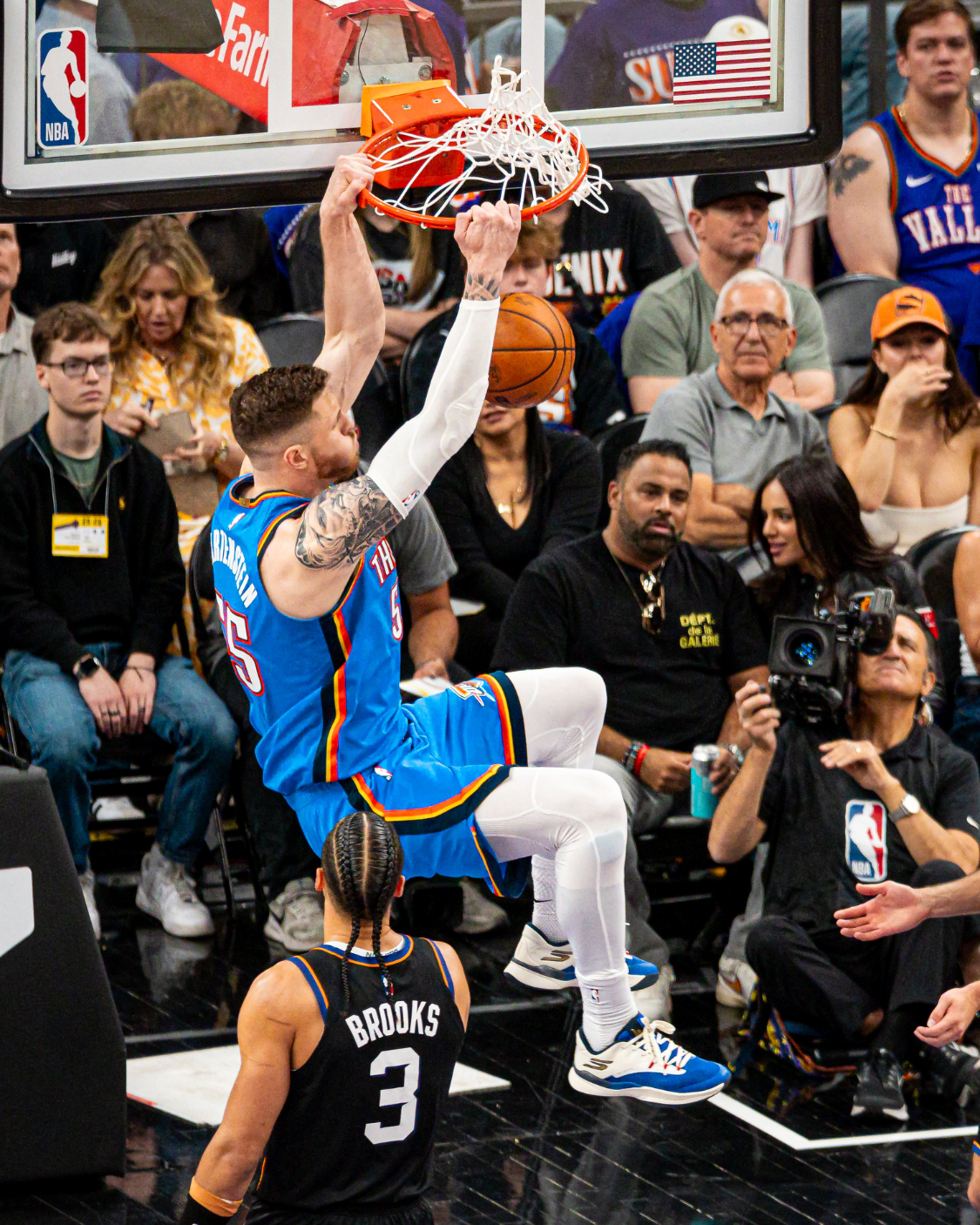 吉莱斯皮三分中的,他率队以7-2的反击波开始第三节,太阳队追至60-64。亚历山大发力又进两球,一轮7-0的小高潮,雷霆队再次领先两位数。布克脚踝有些扭伤返回更衣室,布鲁克斯站出来连得4分咬住比分。亚历山大跳投得分,布克重回赛场中投得分。双方拉锯几个回合,维金斯和卡鲁索联手5分,雷霆队在本节还有3分45秒时以81-69领先。格林再次开火,连中2个三分球,一人连拿8分,亚历山大连投带罚回应4分结束第三节,雷霆队以87-79领先8分。